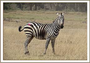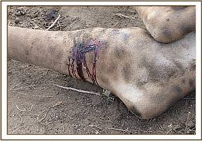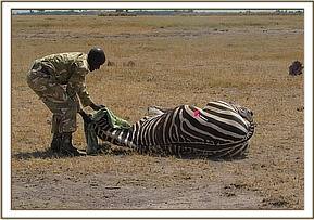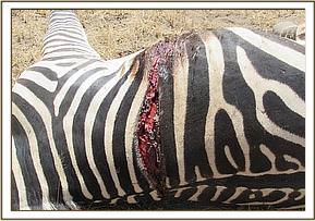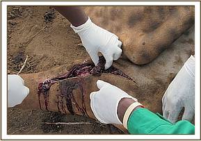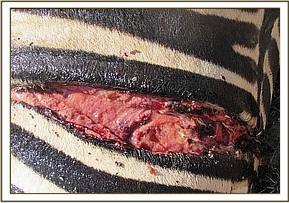 On physical examination the zebra had a deep and long sharp edged cut on the flank region which could have been caused by a predators attack. The wound was septic, about 75 cm long and gaped.