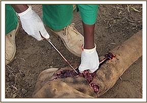 On general examination, the animal was in a fair body condition and was lying on the right lateral side adjacent to a cliff. There were also signs of struggle above the cliff indicating that she must have fallen off the cliff just at about the time of her death. She had a penetrating wound on the left abdominal region caudal to the umbilical region. The penetrating object had penetrated into the gut about 15 cm from the spinal region suspecting the attacker to have positioned himself from the top of a cliff or a tree. The carcass was then flipped to left lateral recumbency for further examination. No other external injury was visible on the left abdominal region. The wound was probed for any foreign objects but none was observed.
