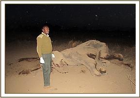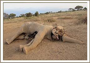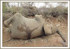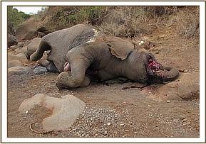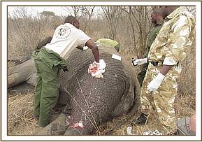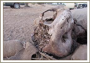 On physical examination, no physical injury was observed on the carcass. At the head region, there seemed to have been a cut with a sharp object after death of the elephant probably an aftermath of the removal of the tusks.