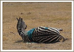 The zebra was immobilized using 7 mgs Etorphine Hydrochloride and 60 mg azerperone in a 3cc dart toped up using water for injection. Darting from a vehicle was done using Dan-inject system. Full immobilization took place after 5 minutes and he fell on lateral recumbence. The zebra was blind folded and opticlox applied to the eyes to avoid damage.