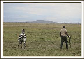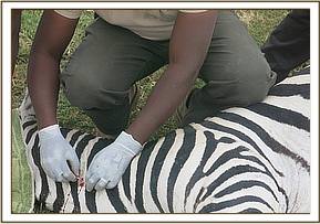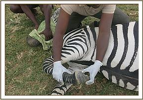 The zebra was observed to be lame resulting from an injury to the left hock joint. The limb was swollen at the hock joint but no external injury was visible. The zebra was injected with 50 ml Betamox and 50 ml Flunixine meglumine at different sites intramuscularly. The entire operation lasted about 15 minutes.