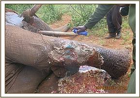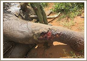 On physical examination the elephant had a penetrating wound on the right limb most likely caused by a spear. The wound was septic and full of pus. The dead tissue was debrided and removed before the wound was thoroughly cleaned using water and Hydrogen Peroxide and then lavaged using tincture of Iodine.