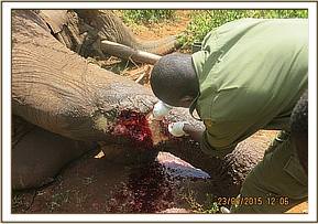Topical antibiotic cream and green clay was then applied into the wound to facilitate healing and avoid infection. The elephant was then injected with 200ml Amoxcycillin, 100ml Flunixine meglumine at different sites intramuscularly. The entire operation lasted about 30 minutes.