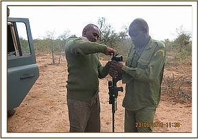 The elephant was immobilized using 18 mgs Etorphine Hydrochloride in a 3cc dart using the Dan-inject system. Full immobilization took place after 8 minutes and he fell on right lateral recumbency. The trunk was maintained patent using a piece of stick placed across the nostril entrances. The ears were used as blindfold.