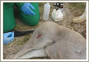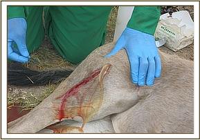The discharging wound was possibly due to an unsuccessful hyena attack. The injury was more than two weeks old and had no maggot infestation. Due to shearing of the muscles the dead space was about fifteen centimeters deep though there was no muscle tear
