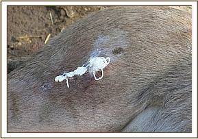 The pus filled pouch was infiltrated with Hydrogen peroxide and Tincture of Iodine, then drained manually three times. This ensured thorough cleaning of organic debris from the pouch. It was then infused with 10 grams of Cloxacillin antibiotic cream after which wet green clay was packed into the wound. Superficially it was sprayed with Tetracycline wound spray to repel flies from feeding from the site. Finally, 50ml Catosal as a metabolic stimulant, 30000mgs Tetracycline broad spectrum antibiotic and 100mgs Dexamethasone anti-inflammatory were administered at different intramuscular sites.