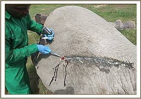 A quick examination was conducted on the seemingly injured trunk. It was established that the injury had healed completely and what was appearing pinkish was the inner mucosa of the exposed trunk. The 2/5 distal portion of the trunk was loosely attached to the upper portion, though this was still functional. There was no need to amputate and suturing trunks has been proven to be ineffective due to muscular contractions and elasticity. The animal had to be revived quickly in order to avoid any complications of narcosis.