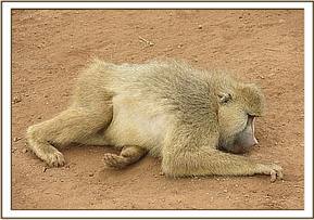 A dart for a male baboon of approximately 30kg was prepared prior to the search for the candidate. This constituted of 750mgs Ketamine in 3cl topped up with water. The troop was located near the park headquarters’ airstrip. The intern darted the baboon from the vehicle and directed the driver on how to approach. It was fully immobilized in five minutes and taken under an acacia shade on a stretcher where the procedure could be carried out safely.