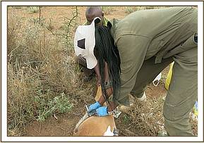 Whole blood was sampled from the jugular vein and a tissue sample collected for genetic study. An ear notch on the left ear was made for post release monitoring. The notch was sprayed with Tetracycline wound spray topically while bleeding was controlled by preplacing the clamps before cutting. Ticks were collected from different locations on the animal and placed in tick bottles with preservative. A fecal sample was collected from the rectum and placed in a fecal bottle for egg count and parasitology.