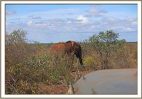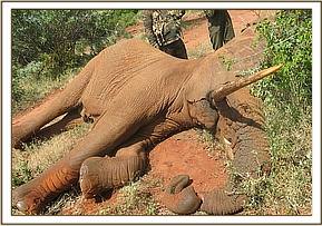 This male elephant had a severe trunk injury and was reported at the Kilaguni waterhole by the Lodge security personnel. The Vet Unit travelled from Amboseli National Park to Tsavo West National Park Kilaguni Lodge and met the lodge manager regarding the injured male elephant. It had been spotted last evening retreating into the nearby bush together with four other males. After an hours search the elephant was discovered 2kms away in the company of several males, females and calves.