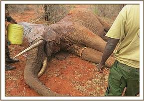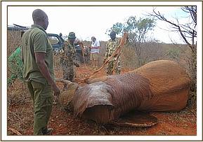 Narcosis was to be achieved by using 2mgs Etorphine and 30mgs Azaperone. To counter respiration risk, 10mgs Butorphanol was pre-drawn using a 2cc syringe. A candidate was identified and successfully darted. It took eight minutes to be fully immobilized after wobbling up and down for last 2 minutes of sedation. An examination was carried out prior to surgery and after the animal was found to be in good health, the operation commenced.