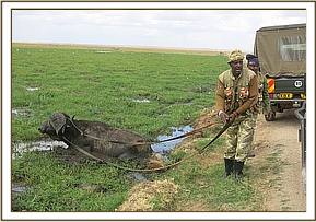 Once everything was set, the vehicle was given a go ahead and the animal was pulled to the dry road edge while on left lateral recumbence. The rope was quickly released from the vehicle but the animal remained on lateral recumbence allowing the vet to remove the rope from the horn. The buffalo was then pushed onto sternal recumbence whilst groaning in protest at our presence. It tried to get up but the left hind limb seemed to have suffered severe numbness and couldn’t support the weight in the full upright position. We left it alone to avoid unnecessary stress on the animal. The security team were instructed to visit after one hour and report on the buffalos condition and when they went to check on the bull, it had already gone on its’ way.