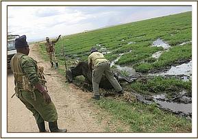 A buffalo in distress was seen at the Iremito causeway within Amboseli National Park. It was stuck in mud. The Vet Unit was informed of the incident by the Park Security Team whilst on their usual patrol duties. An intervention was immediately mounted.