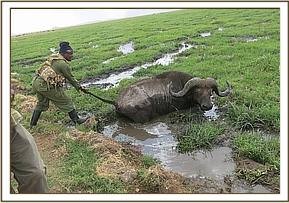 This old rogue buffalo was alert and on sternal recumbence close to the road. It was urged to move by probing and pulling its’ tail but it was unable to free itself from the mud. It was evident that it had attempted to get out for quite some time. The vet unit anchored one end of a rope to the vehicle and looped the other end around the horns, which was done by throwing the rope from the roadside. The rope looped around the base of the right horn and it was assumed that it would be enough for the pull. Once free from the mud, the vet unit planned to quickly release the rope attached to the vehicle to avoid using immobilizing drugs.