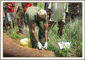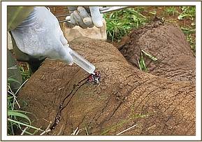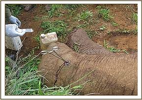 Two darts were used on the candidate. The first dart constituting of 18mgs Etorphine landed on the left mid humeral area medially as the elephant was adamant to face away from the approaching vehicle. It was startled but due to the severity of lameness it could not go far. Unfortunately after fifteen minutes post darting there was no impending signs of sedation necessitating another darting. This time another dart of same composition was placed on the left rump laterally. This resulted in standing immobilization after another fifteen minutes. The candidate was approached from behind and two men pulled the elephant into a dog sitting position then with a strap on the left tusk it was pulled by the vehicle onto right lateral recumbence exposing the injured limb for retreatment.
