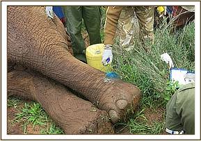 The elephant was found in the company of the three other elephants, browsing within an open savannah. The chopper landed some distance away. The candidate exhibited serious lameness of the left hind limb which had an open swollen wound at the ankle. Two vehicles were on site; one for Big Life and the other for Amboseli Park.