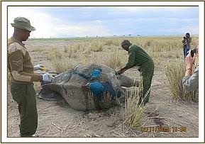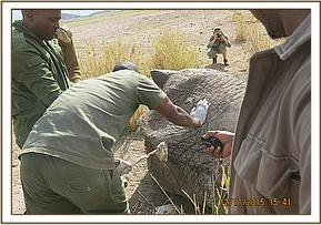 The elephant was immobilized using 16 mgs Etorphine Hydrochloride in a 3cc dart using the Dan-inject system from the helicopter. The elephant first went down in sternal recumbence after 10 minutes and was flipped over to lateral recumbence using a land cruiser. The trunk was maintained patent using a piece of stick placed across the nostril entrances. The weather was favourable (rainy) for anaesthesia hence temperatures were at optimum. The ears were used as blindfold.