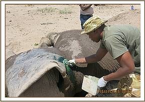Full immobilization took place after 8 minutes and he fell in a dog sitting position. The rangers helped flip the elephant to left lateral recumbence for easy access to the wound and safety of the elephant. The trunk was maintained patent using a piece of stick placed across the nostril entrances. The ears were used as blindfold. Plenty of water was doused on the ears (pinnae) and the entire body to help cool the elephant during the operation.