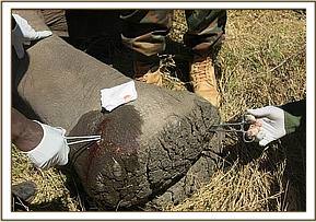 The elephant was darted from the vehicle using 18mg Etorphine Hcl. The anaesthesia was effective in 8 minutes and the animal went down on right lateral recumbence (lying on the affected leg). The elephant was roped and moved to a left lateral position to expose the injured leg for convenient and effective examination and treatment.