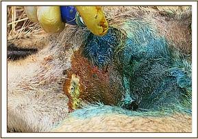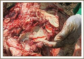 The right rear leg had a penetrating spear wound with a lateral entry point penetrating downwards and deep through the sole of the affected limb. There was no foreign object recovered from the wound and there was also no bone involvement. The soft tissue affected was fairly fresh with mild exudate of pus just starting to develop.