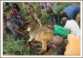 Initial examination before darting depicted a weak emaciated old bull probably poor health exacerbated by prevailing dry season. Attempts to urge it to move proved difficult and it ended up lying down in sternal recumbence. Plans were made for it to be translocated away from the community area to the nearby forest area where there is minimal human activity. With the help of the community it was manually loaded into an empty pick up using slings and a stretcher. It was placed on right lateral recumbence with head first and secured safely using ropes. The tongue was pulled out to the left side to allow drainage of any saliva and or ruminal fluids. It was transported away and released safely deep in the nearby forest.