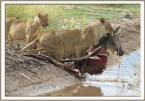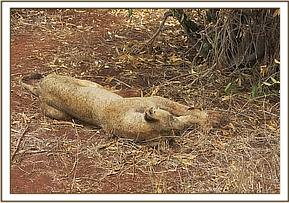 It was observed that the pride composed of four members; a lioness and her three cubs. They were found scattered but within sight of one another. The Lioness was lying down with two cubs close by while the third cub was on the wildebeest carcass near the edge of the road. All had swollen bellies, an indication that they had had their fill. Keen observation revealed that some cubs had bloody coloration on their front limbs but no member needed vet assistance. All were observed while in motion as mother picked the carcass to hide it and the three cubs followed energetically. They were left to enjoy their meal peacefully.
