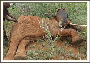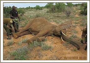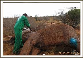 The elephant was chemically restrained by use of 16mgs Etorphine in a 3ml Dan inject dart through the Dan inject darting system from a vehicle. She appeared agitated initially but finally calmed as the drugs took effect. She was fully narcotized after 7 minutes assuming left lateral recumbency.