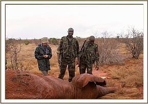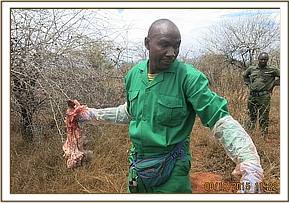 On physical examination the elephant had a penetrating wound to the left hind limb. The wound was relatively fresh and likely to have been caused by an arrow head. The wound was thoroughly cleaned using water and Hydrogen Peroxide before it was lavaged using tincture of Iodine. Topical antibiotic cream and green clay was then applied into the wound to facilitate healing and prevent infection. The elephant was then injected with 100 ml Betamox L.A and 50 ml Dexamethasone at different sites intramuscularly. The entire operation lasted about 20 minutes.