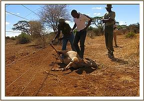An eland was reported trapped in an electric hotel fence in the Amboseli ecosystem. The veterinary team attended to the case immediately.