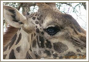 On physical examination the giraffe had suffered from an eye infection leading to total loss of the left eye. The right eye was treated using a combination of 3ml penicillin streptomycin and 3ml Dexamethasone HCL. Antibiotic cream was also applied.