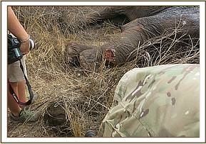It was darted with 1.5mgs Etorphine in 1.5cc dart filled with 500I.U Hyalase. Vehicle darting was used and the elephant was within a family of ten individuals. The dart landed on the right gluteal muscle; he was slowly limping on the left hind limb. The aim was to immediately chase the other family members to a safe distance immediately after the calf went down following narcosis. It was fully immobilized in five minutes assuming right lateral recumbence.Promptly thefamily members were chased away using one vehicle as the other vehicle remained to safeguard the vet team. The left ear was used as blind fold and trunk was kept patent with aid of a piece of stick across distal open end.