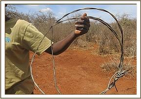 The winch snare wire snoop was around the distal metatarsal area of the right hind limb barely tight and there was no resultant traumatic wound. It was about five meters long and was brushing against obstacles (bushes) as the animal ambulated, acting as a nuisance. The snare was quickly loosened and taken off the limb distally. The animal was covered with 50mgs Dexamethasone intramuscularly to stabilize cell membranes because of the running before and after darting.