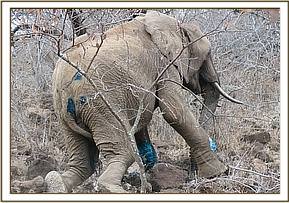 The elephant was spotted and reported by community game scouts as having lameness and remaining static most of the time.