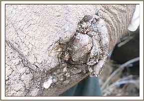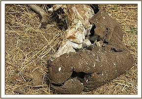 -The carcass was tossed on to left recumbence and conspicuous were several tearing wounds on the left hind and fore limbs laterally midway. The hind went through the cartilage of genu joint interfering with joint integrity and surrounding soft tissue. The fore one though latero-caudally on elbow joint didn’t get into tge joint itself but damaged the soft tissue only. All wounds had foul smell with necrotic tissue present.