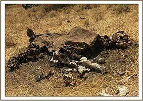 -It was in sitting position and two tusks were missing. The carcass had dried up and little foul smell was still present.