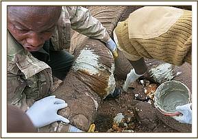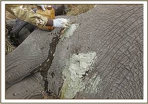 Both wounds were carefully cleaned with Hydrogen Peroxide and Tincture of Iodine allowing removal of dead debris through effervescences. It was followed by infiltration of Tetracycline wound spray into the cleaned cavities followed by generous packing of Green Clay. The elephant was injected with 40mgs Dexamethasone through the ear vein and 30ml Catosal and 15000mgs Amoxicillin intramuscularly at different sites. The dart wound was infiltrated with one Cloxacillin cream tube to avoid abscessiation.