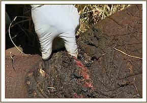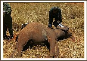 It was darted with 13mgs Etorphine in 1.5cc dart filled with water for injection. It was in some shrubs which made the approach by vehicle impossible, thus the animal was darted on foot. The dart landed on the right rump prompting the animal to run away with difficulties. It was fully immobilized in seven minutes assuming a sitting position. It was pushed to the left lateral recumbence manually. The right ear was used as blind fold and trunk was kept patent with the aid of a piece of stick at extreme open end.