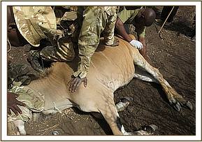 The left hind limb had a swelling medial side at hock joint and was the one causing lameness. It was aspirated using gauge no. 19 needle and yielded flank blood meaning it needed time to ripen before it is drained or lacerated. The tail had a kink at the middle which was due to a transverse wound which was almost severing it completely. This was thought to have been caused by hyena it an attempted attack. The candidate was weak and seemed pregnant which was a burden due to its foot and poor forage cover.