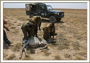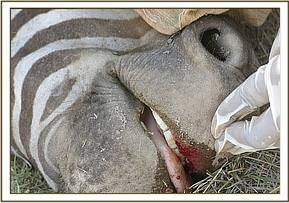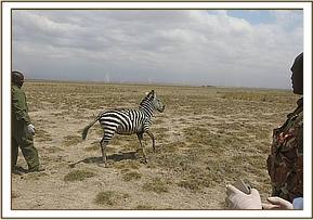 A casual worker while on his duty within the Amboseli Park called the Mobile Vet Unit concerning unwell zebra which was seen wobbling and drooling saliva with its open mouth. It could not keep pace with the rest of the herd and kept dull demeanor. A quick response was mounted.