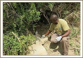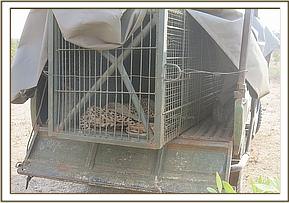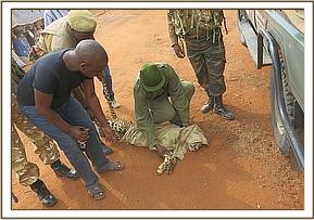 The release site was at Lugard identified for its’ habitation being adorned with suitable prey and water. The carrier vehicle was reversed near a green shrub preferred for its’ shade. The candidate was offloaded and placed under the shade. It was examined for any injury and found to have a penetrating wound at the right fore pawl medially. It had pus discharge. It was cleaned using Hydrogen Peroxide and Tincture of Iodine and then infiltrated with 5gms of Cloxacillin Ointment followed with Tetracycline wound spray topically. The body score was at level 2 taking 5 as well muscled and 1 as poor muscled. The belly was full since it had predated on the goat.