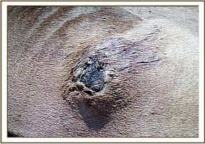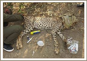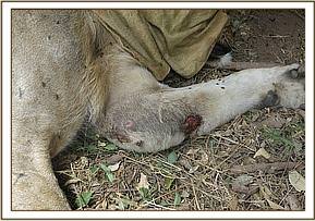 A blind fold was placed on the eyes. It was observed that before darting it was exhibiting panting due to high ambient temperature. It was fully engorged as depicted by swollen stomach indicating a good meal in less than twelve hours earlier. Examination revealed swollen pus discharging left elbow joint occasioned by what appeared to be multiple bite marks. This was assumed to have been caused by other lion(s) through territorial fights as their mating season culminates. This injury caused hopping lameness on the said limb as confirmed by the guide who spotted it. No any other injury was observed.