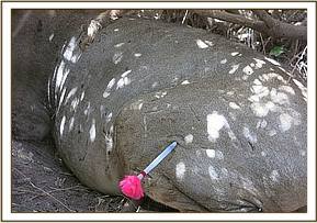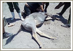 It was darted with 1mg of Etorphine and 20mgs of Azaperone because of its’ poor health condition. It took a little bit longer than expected which went up to ten minutes post darting. It was examined but decided to put it down humanely and carry on with postmortem.