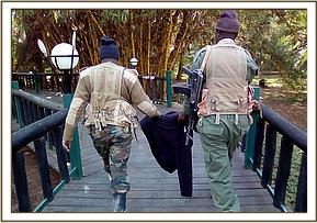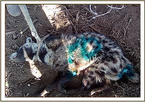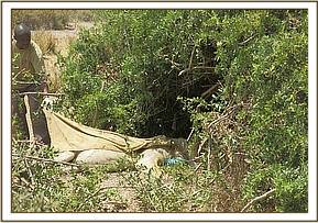 The manager was quick to point out that it had been in a fight with baboons as they scavenged together at a pit on lodge garbage. A blindfold was thrown over it but it was aggressive as it attempted to bite and escape. It was quickly cornered and blind folded followed by firm grip on its’ neck by one ranger and the other ranger held it at the tail base and hind limbs. It was ferried to the vehicle and secured manually to an appropriate release site within the park. It appeared lethargic probably because it was scared to feed near baboons after the fight and that wounds were septic.