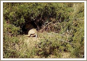 The area was cleared ready for revival. It was reversed using 7.5mgs Atipamezole into neck muscle in one syringe and in another syringe 30mgsDoxapram administered into scapular muscles to quicken recovery. We watched from a distance and the head was up in four minutes with full recovery at tenth minute. It got up and hid itself in the nearby thickets.