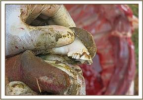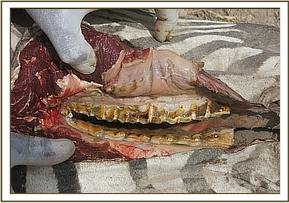 The canines were worn out exposing the sensitive canals at the middle while the molars were extremely worn down almost to the level of the gum. This primarily was thought to be the cause of poor health exacerbated by lack of palatable forage at this particular dry period.