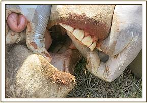 A On the head there was buccal external swelling which depicted submandibular pitting edema. Within the gum, the capillary refill time was extended from one minute to about two and mucous membranes were pale. Inside the mouth cavity conspicuous was internal swelling on the left buccal side extending to left lower teeth gum line. It was tentatively diagnosed as having general lassitude as a sequel of anemia due to helminthosis compounded by poor nutrition due to the drought.