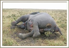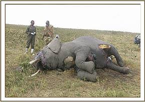 No meaningful postmortem exercise was visible because of decomposition. The carcass was aged as being at least four days old. Impression smears were made from the wet retrieved surface of the tusks for further analysis and rule out anthrax.