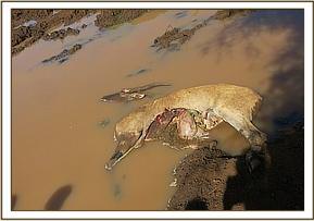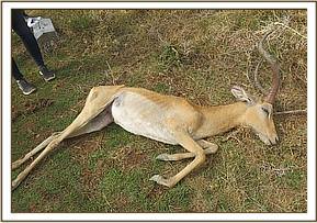 Two scenarios were in the picture. One that the animal collapsed on its’ own during day time while drinking water and second, the animal was attacked at the waterhole while quenching. This arose after more inquiries were made from the lodge personnel.