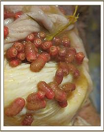 When cut open the large intestines and cecum were full of little thread red worms in thousands some free within lumen together with ingesta while others attached on the mucosa. The mucosal surface grossly depicted areas of hemorrhages, congestion, thickening/hyperplasia, erosion and some ulcerations and necrosis.