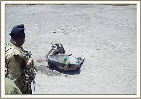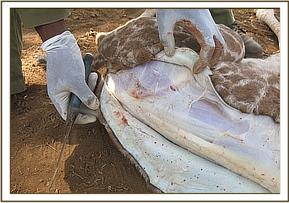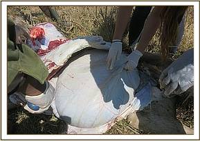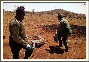 While on surveillance patrol within the park the Mobile Vet Unit spotted vultures dropping down on the ground indicative of a carcass. We drove near only to discover a fresh carcass of a grant gazelle. It was still warm meaning it had just died. Its’ eyes had been gorged out, its’ perineum and testis had been predated on by the vultures. It was on left lateral recumbence. A postmortem ensued to establish the possible cause of death.